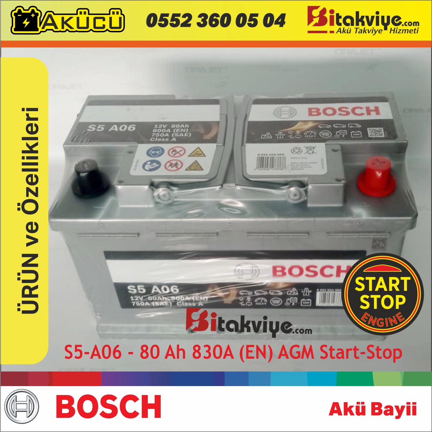 Bosch S5 A06 12 V 80 Ah AGM – 800 A (EN) Akü – Start-Stop-Engine